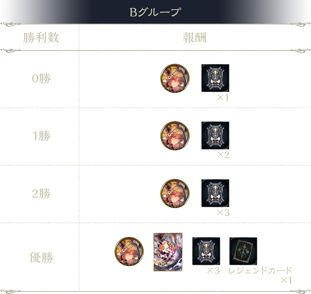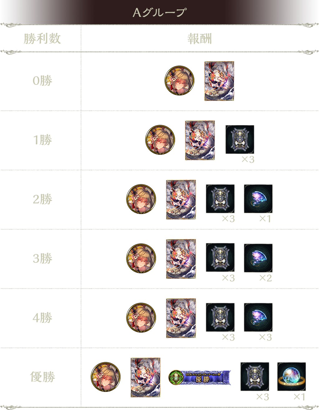 3勝:タイムスリップローテーションカードパックチケット 3枚、オーブの欠片 2個