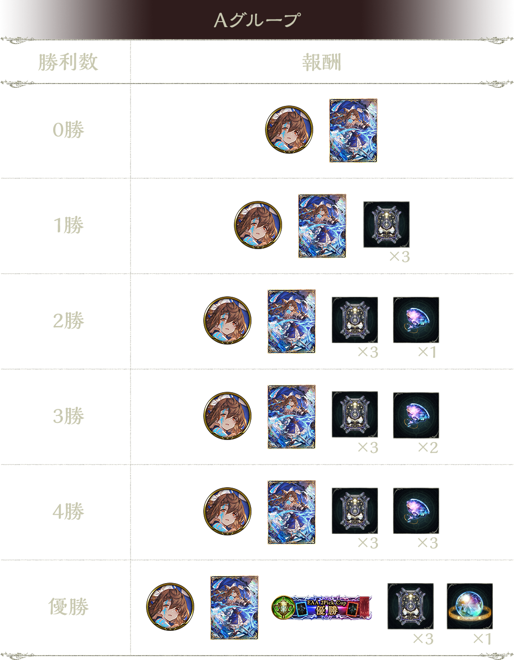 5勝:タイムスリップローテーションカードパックチケット 3枚、プレミアムオーブ 1個、EAA 2Pick Cup 優勝(称号)